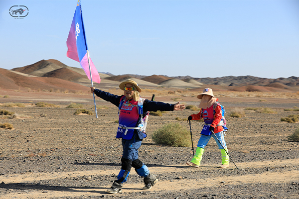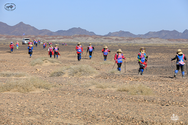 第一天是8小時25公里,牛商們在太陽還沒完全升起來就開始了遠征前的熱身,原力專業(yè)的教練,激昂的樂章,鼓舞著雄心勃勃的牛商們,一聲號令全體出發(fā),萬馬奔騰的節(jié)奏開始了,彩旗飄飄,紅裝戰(zhàn)衣,藍色背包,熒光粉的名號牌,浩浩蕩蕩,塵土飛揚!戈壁我們來了!